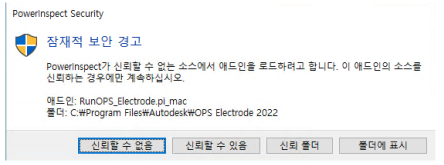 PowerInspect는 애드인을 로드할 때와 같이 PowerInspect 자동화 인터페이스를 통해 작업을 수행할 때 잠재적인 보안 문제를 확인합니다. 신뢰할 수 없는 소스와 같은 보안 문제가 있는 경우 PowerInspect에서 다음과 같이 계속할 수 있는 권한을 요청하는 메시지를 표시합니다.