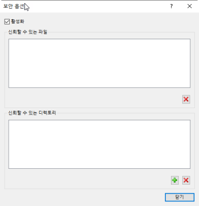 신뢰할 수 있는 파일 — 파일을 신뢰할 수 있는 경우 신뢰할 수 있는 파일 리스트에 파일이 추가됩니다. 여기에서 필요한 경우 이전에 신뢰할 수 있었던 파일을 제거할 수 있습니다.