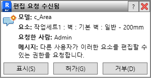 작업 공유 프로젝트를 사용하여 작업하는 경우 의사소통을 원활히 하기 위해 팀 구성원은 요소 차용 요청이 요청, 허가 및 거부될 때 자동 알림 메시지를 수신합니다.