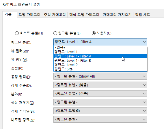 • 링크된 뷰별. 지정된 링크된 뷰에 적용된 필터를 사용하여 링크된 모델을 표시합니다.