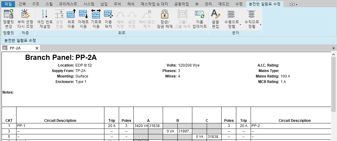 분전반 일람표가 표시되면 회로를 위, 아래, 왼쪽 및 오른쪽으로 이동할 뿐만 아니라 적절하게 그룹화하고 잠궈서 패널에서 회로를 재정렬할 수 있습니다. 또한 상 간 부하를 균형 조정하고 예비 및 공간을 지정하며 회로 이름을 업데이트할 수 있습니다.