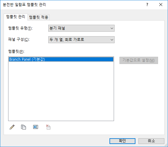 분전반 일람표 템플릿 관리 대화상자를 사용하여 분전반 일람표 템플릿을 편집, 복제, 삭제 및 적용할 수 있습니다. 또한 기본 템플릿도 지정할 수 있습니다.