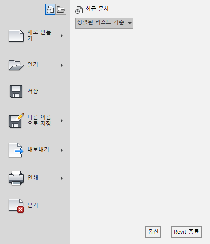 최근 문서를 클릭하여 최근에 연 파일 리스트를 표시합니다. 드롭다운 리스트를 사용하여 최근 문서의 정렬 순서를 변경합니다. 압정을 사용하면 얼마나 최근에 문서를 열었는지에 관계없이 리스트의 문서를 유지할 수 있습니다.