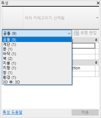 유형 선택기 바로 아래에는 도구에서 배치할 요소의 카테고리 또는 도면 영역에서 선택된 요소의 카테고리 및 번호를 식별하는 필터가 있습니다. 여러 카테고리 또는 유형을 선택하는 경우 모두에 공통되는 인스턴스(instance) 특성만 팔레트에 표시됩니다. 여러 카테고리를 선택하면 필터의 드롭다운을 사용하여 특정 카테고리 또는 뷰 자체에 대한 특성만 봅니다. 특정 카테고리 선택은 전체 선택 세트에 영향을 미치지 않습니다.