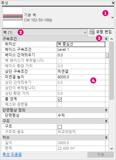 특성 팔레트는 요소의 특성을 정의하는 매개변수를 보고 수정할 수 있는 모덜리스 대화상자입니다.