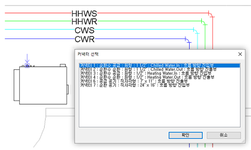 새 구성요소를 둘 이상의 시스템에 연결할 수 있는 경우 커넥터 선택 대화상자가 열립니다. 각 배관 커넥터는 색인 번호, 시스템 분류, 모양, 크기, 커넥터 설명 및 흐름 방향과 함께 나열됩니다. 커넥터 설명은 커넥터에 지정해야 하는 시스템 유형을 나타내는 데 사용할 수 있습니다. 화살표는 선택한 커넥터의 위치와 방향을 표시합니다.