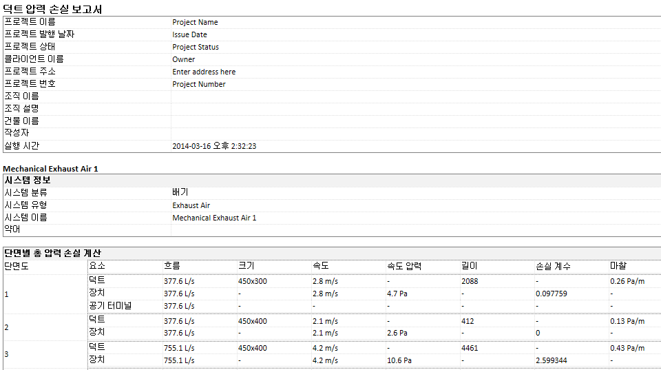 덕트 압력 손실 및 파이프 압력 손실 보고서에는 자체 보고서 형식이 있습니다. 보고서 형식은 기본 템플릿과 같은 위치에 저장됩니다.