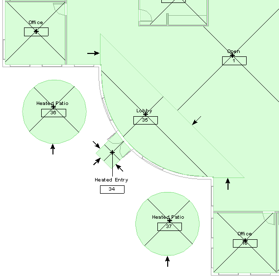 위 그림에서는 개구부 1 영역에 공간이 포함되어 있었습니다. 이 공간은 공간 구분 선에 의해 구분되어 새 영역이 작성되었습니다. 공간이 새 영역에 추가된 다음 로비 태그가 지정되었습니다. 히터가 있는 패티오는 공간 구분 선에 의해 작성된 경계 영역의 예입니다. 히터가 있는 입구와 로비는 공간 구분 선에 의해 작성된 반경계 영역의 예입니다. 화살표는 공간 구분 선을 나타냅니다. 공간 참조선이 표시되어 공간 경계를 나타냅니다. 구역은 사용되지 않았습니다.