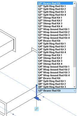행거 지지 로드가 보조 키트(예: 1/2" 베어러 로드 키트)에서 지정되면 Revit에서 새 지지 로드를 클릭하고 드롭다운 리스트에서 새 보조 키트(로드 크기)를 선택하여 새 지지 로드 지름을 선택할 수 있습니다.