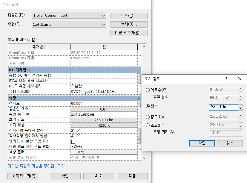 초기 강도와 광손실률은 모두 각 조명 설비 유형의 유형 특성입니다. 설비의 유형 특성 대화상자에서 이러한 특성에 액세스합니다.
