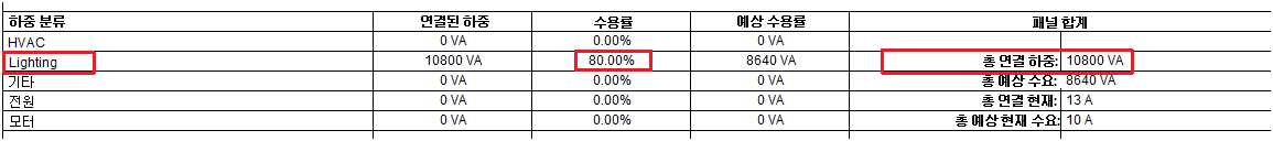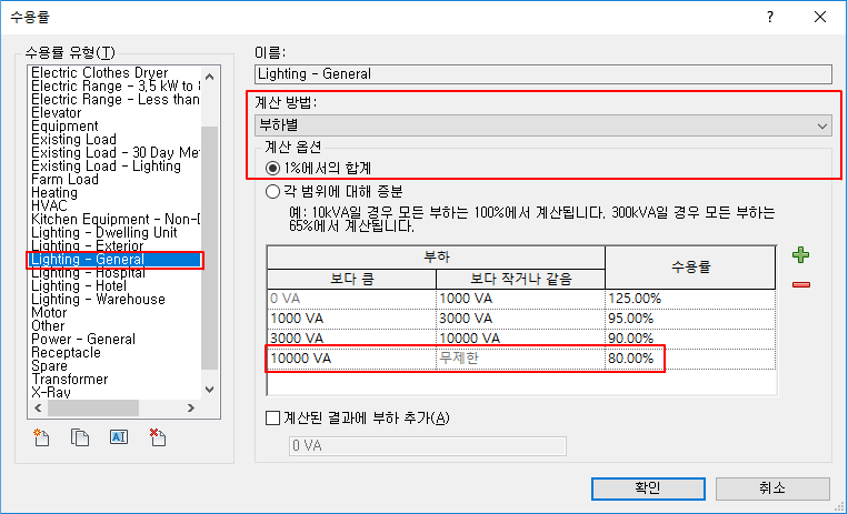 조명 수용률이 총 계산을 백분율 단위로 변환한 부하로 계산하여 지정되었습니다. 부하가 10000VA보다 클 경우 수용률은 80%입니다.