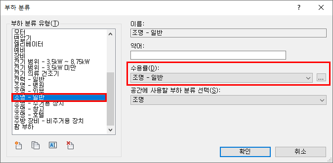 조명 수용률은 해당 조명 부하 분류 유형에 지정되었습니다.