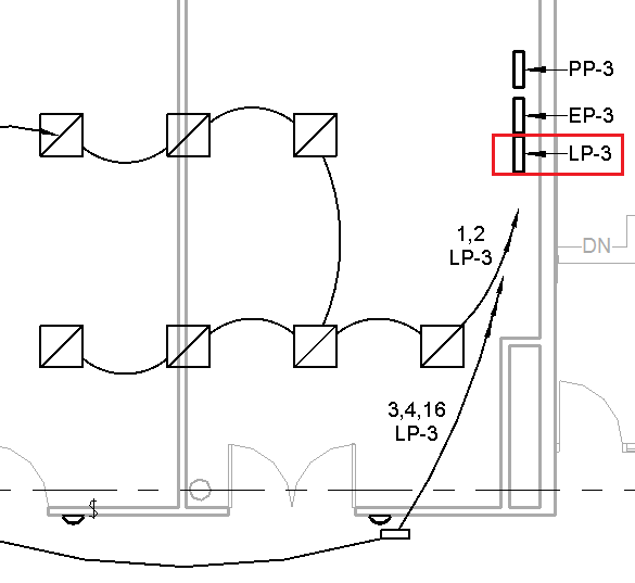 이 예제의 경우 조명 평면도에는 20개 회로에 연결된 LP-3이라는 배전반이 있습니다.