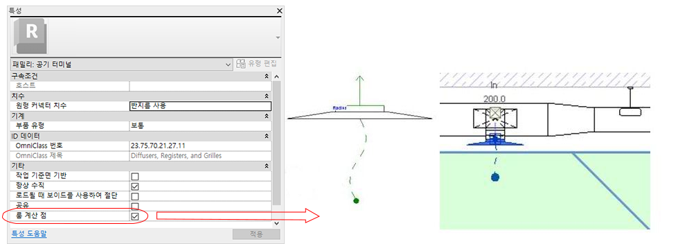 - 덕트 측면에 공기 터미널을 배치하는 경우 삽입점이 패밀리 삽입점입니다.