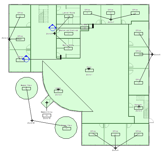 구역 도구를 사용하여 난방, 냉방 및 습도 제어 시스템과 같은 환경 제어 시스템으로 제어할 수 있는 공간을 정의합니다. 이 항목을 사용하여 건물 모델에 부하 균형 조절 및 해석 절차를 수행할 수 있습니다.