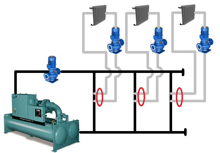 - 순환(1차, 2차, 3차 등등)당 하나의 펌프 또는 펌프 세트 - 각 순환에 대해 흐름 및 압력 강하를 계산할 경우.
