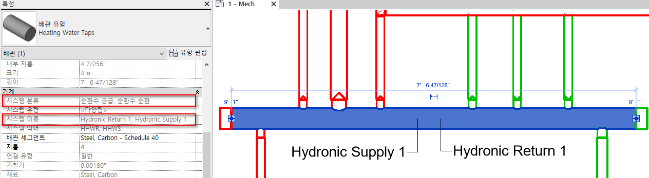 2차 순환이 탭 연결을 사용하여 헤더에 연결되면 헤더에 1차 순환의 공급 및 순환 시스템이 모두 포함됩니다. 이러한 시스템은 아래 이미지의 태그에서 보듯이 배관의 중심에서 분할됩니다. 두 시스템 이름 및 시스템 분류 모두 특성 팔레트에 표시됩니다.