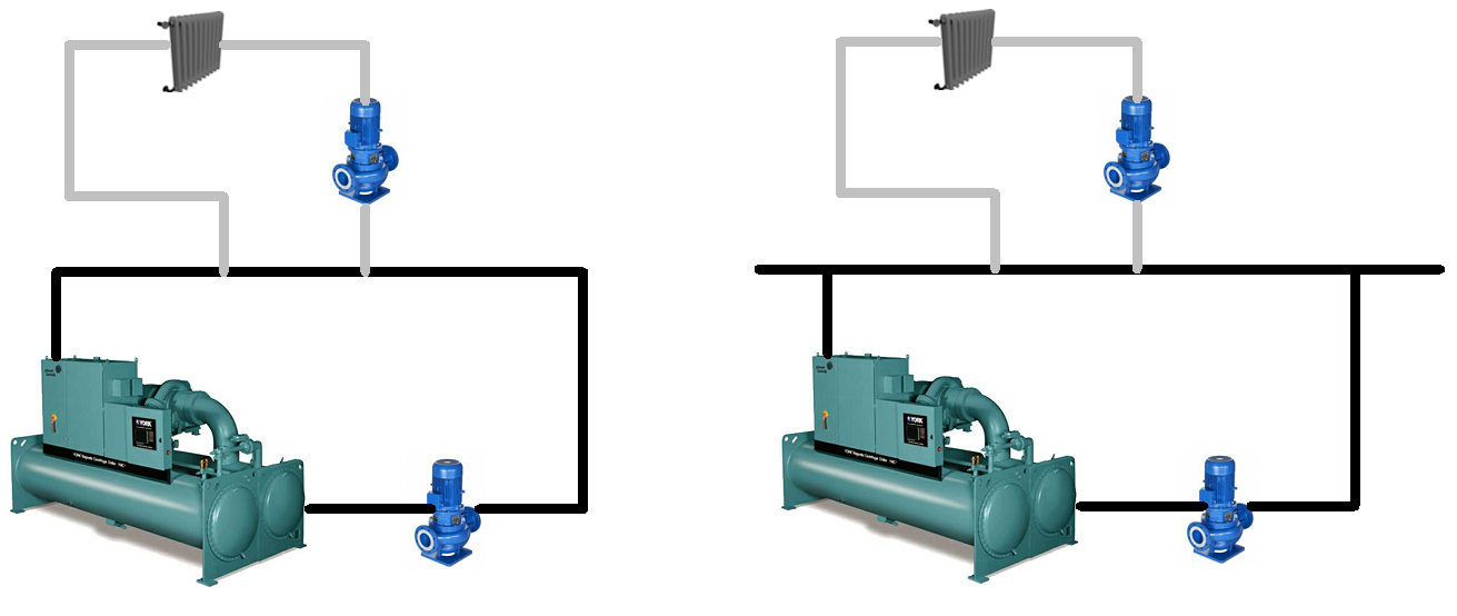 분리 전 순환수 네트워크 - 1차 순환(왼쪽) 및 낮은 손실 헤더가 있는 1차 순환(오른쪽 )