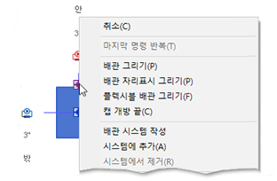 상황별 메뉴에서 추가: 장비 또는 설비 패밀리의 배관 커넥터 위로 마우스 포인터를 이동하고 마우스 오른쪽 버튼을 클릭하여 상황별 메뉴를 표시합니다. 배관 그리기를 클릭하여 배관을 추가하고 커넥터에서 크기 및 입면을 상속합니다. 배관은 커넥터와 동일한 시스템 분류에 지정된 시스템 유형을 사용합니다. 이 방법은 입면도 또는 단면도에서도 사용할 수 있습니다.