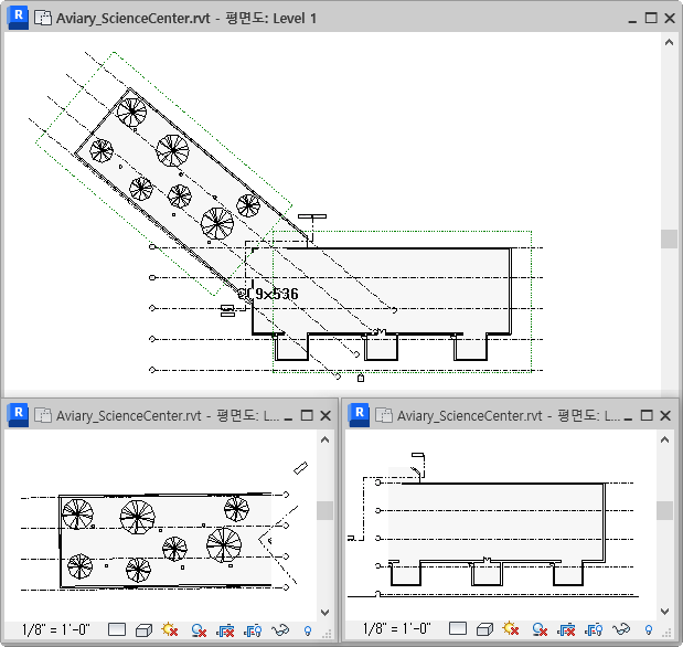 예를 들어 다음 그림의 상단 뷰에는 주 건물과 별관 주위에 스코프 박스가 표시되어 있습니다. 스코프 박스 1은 주 건물의 그리드 선에 적용되어 있고 스코프 박스 2는 별관의 그리드 선에 적용되어 있습니다. 따라서 의존적 뷰(하단)에는 건물의 각 부분에 적용되는 그리드 선만 표시됩니다.