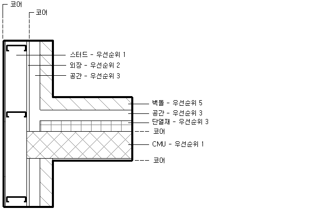 다음 그림에서는 더 높은 우선순위 레이어가 더 낮음 우선순위 레이어보다 먼저 결합되는 것을 보여줍니다. 수평 벽의 우선순위 1 CMU 레이어는 수직 벽의 우선순위 1 스터드 레이어에 도달할 때까지 모든 레이어를 통과합니다. 수평 벽의 단열재는 수직 벽의 공간을 통과하지 않습니다. 이는 둘 다 우선순위 3이고 코어 레이어 외부에 있기 때문입니다.