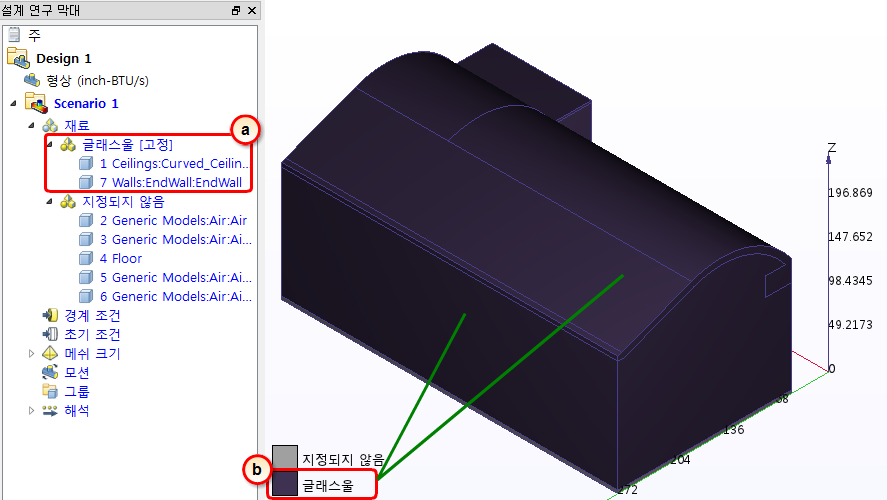 6. 해당 글래스울 재료가 제대로 지정되었는지 확인하려면 설계 연구 막대 및 부품 색상 지정을 확인합니다.