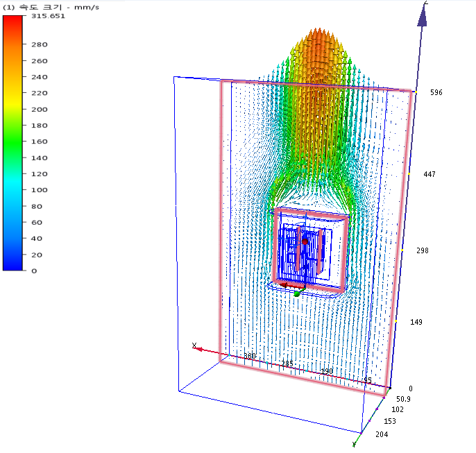 절단면은 모형을 통과하는 슬라이스 위에 결과를 표시합니다. 이를 통해 흐름을 포괄적으로 이해할 수 있습니다. 장치 전체의 속도 방향 및 크기를 표시하려면 벡터를 사용합니다.