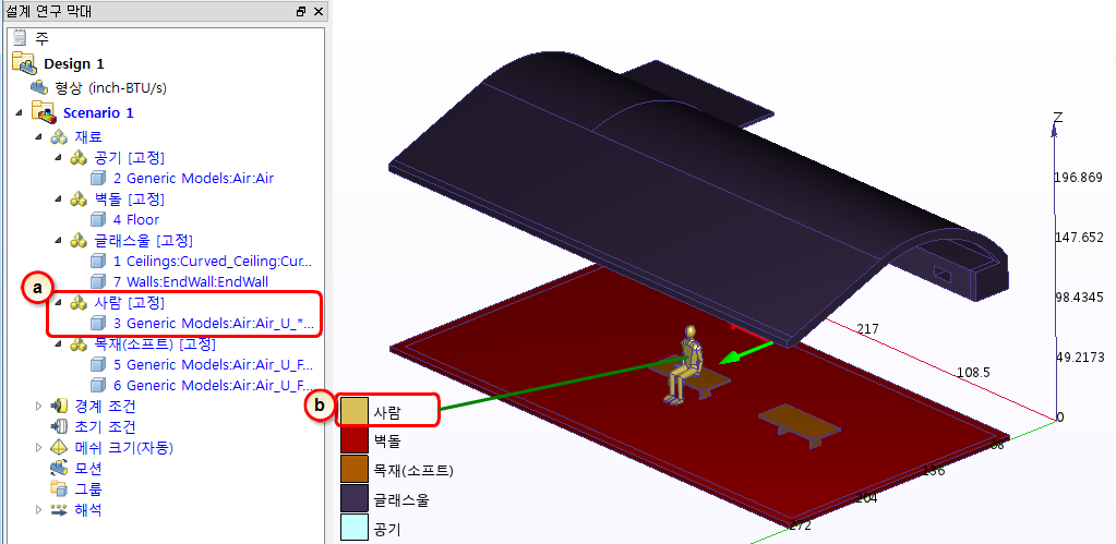 이 단계에서는 인체의 열물리학 특성을 시뮬레이션하는 재료를 점유자에게 지정합니다. 설치된 기본 재료 데이터베이스에 실제 "신체" 재료는 포함되어 있지 않으므로 유사 재료로 실리콘을 사용합니다. 보다 엄격한 접근 방법은 인체의 실제 특성을 갖는 재료를 작성한 다음 사용자 재료 데이터베이스에 추가하는 것입니다.
