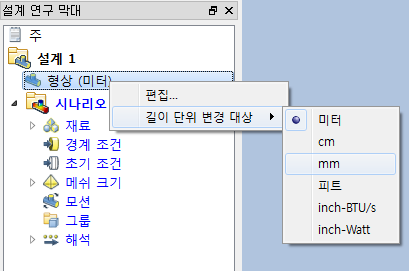 다른 CAD 도구나 데스크탑에서 시작하는 경우 설계 연구 막대의 형상 분기를 마우스 오른쪽 단추로 클릭하여 길이 단위를 mm로 변경합니다.