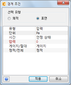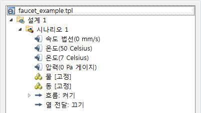 모형에 1개의 속도 경계 조건, 2개의 온도 경계 조건 및 1개의 압력 경계 조건이 있습니다.