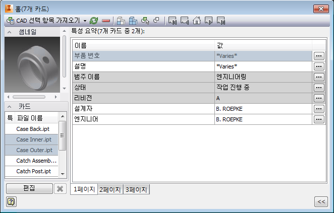 CAD 캔버스나 모형 또는 Vault 검색기 리스트에서 부품을 선택할 때마다 캔버스 및 리스트에서 해당 부품이 강조 표시되고 해당 부품에 대한 관련 정보를 표시하도록 데이터 카드가 자동으로 업데이트됩니다.