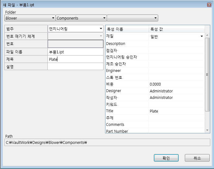 Vault Data Standard 대화상자는 Inventor 및 AutoCAD에서 사용할 수 있습니다. 파일을 처음 저장할 때마다 Data Standard 대화상자가 표시됩니다. 관리자가 설정한 필수 필드 및 추가 필드에 내용을 입력하고 확인을 클릭하여 데이터를 저장합니다. 데이터는 나중에 수정 가능한 데이터 시트로 저장됩니다.