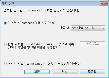 - 사이트 선택 대화상자에서 인스턴스(instance) 이동 위치 라디오 버튼을 선택하고 링크가 현재 있는 위치 이름(예: Arch House 1-3)을 선택합니다.