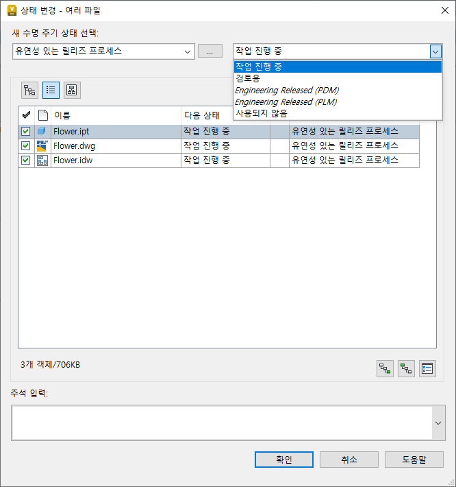 주: 여러 객체를 선택한 경우 선택한 모든 객체에 적용할 수 있는 상태만 새 수명 주기 상태 선택 리스트에서 사용할 수 있습니다.