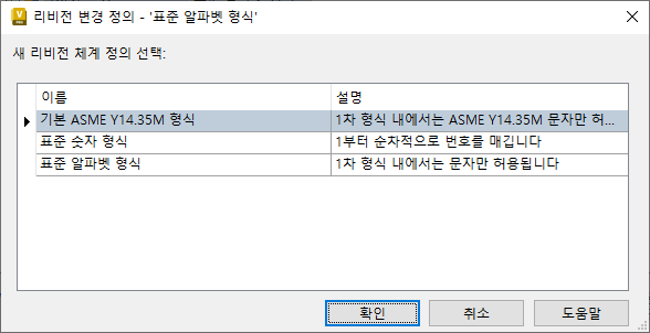- 리비전 체계 정의 변경 대화상자에서 선택한 항목에 지정하려는 새 리비전 체계를 선택합니다. 확인을 클릭합니다.