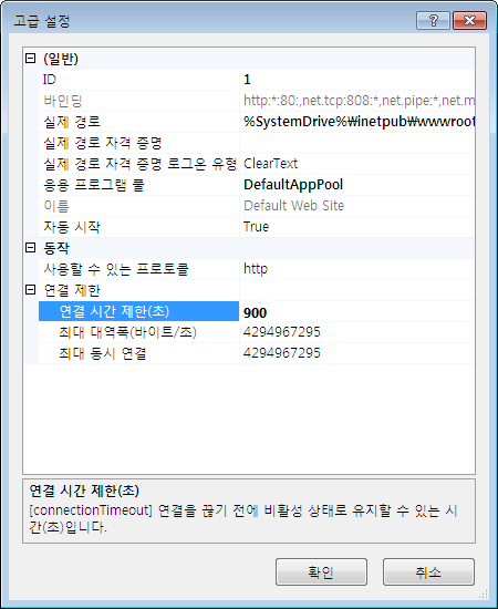 IIS 연결 시간 초과 기간이 허용 가능한지 확인합니다.
