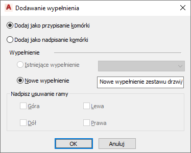Dodaj jako nadpisanie komórki, a wstawianym obiektem mają być drzwi lub okno o stylu innym niż istniejący na rysunku, z usunięciem krawędzi ramy otaczającej obiekt | wybierz opcję Nowe wypełnienie i nadaj nazwę obiektowi. Następnie w obszarze Nadpisz usuwanie ramy zaznacz pole wyboru Góra, Dół, Lewo lub Prawo, po czym naciśnij przycisk OK. |