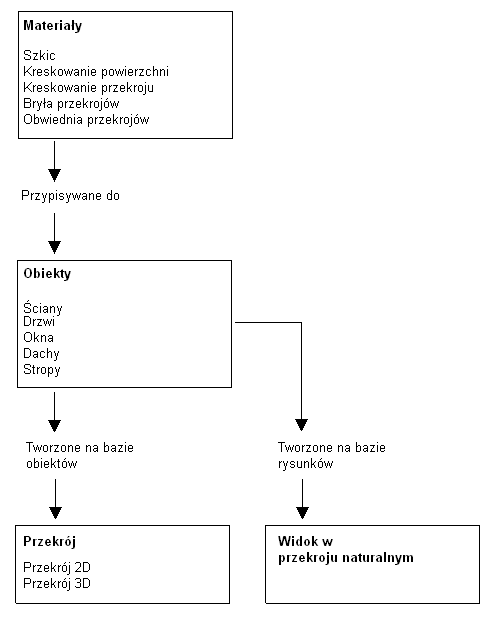 Podczas tworzenia obiektów przekroju 2D i 3D z obiektów budynku przypisania materiałów obiektów źródłowych są stosowane do przekroju. Materiał nie jest przypisywany bezpośrednio do przekroju 2D/3D. Przekrój przejmuje przypisanie materiałów od przeciętych obiektów. Jeżeli na przykład jest tworzony przekrój ściany z oknem, na przekroju zostanie wyświetlone kreskowanie zdefiniowane dla materiałów ściany i okna: szkło, drewno i cegła.