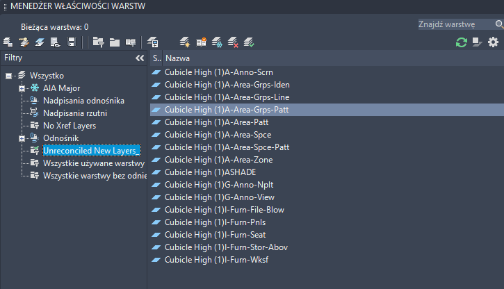 Kliknięcie łącza powoduje otwarcie Menedżera właściwości warstw i automatyczne wybranie filtru Nowe warstwy nieuzgodnione. Wszystkie nowe warstwy, które zostały dodane do rysunku lub dołączonych odniesień zewnętrznych wyświetlane są w formie listy.