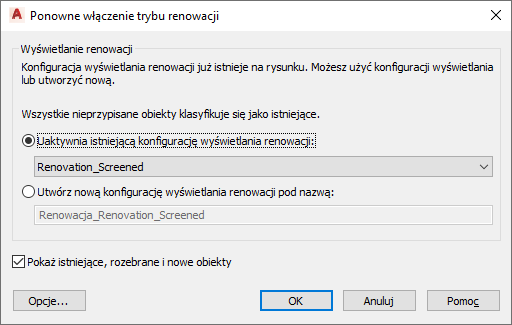 Po ponownym uruchomieniu trybu remontu w uprzednio włączonym rysunku można nadal korzystać z istniejącej konfiguracji wyświetlania remontu lub utworzyć nową.