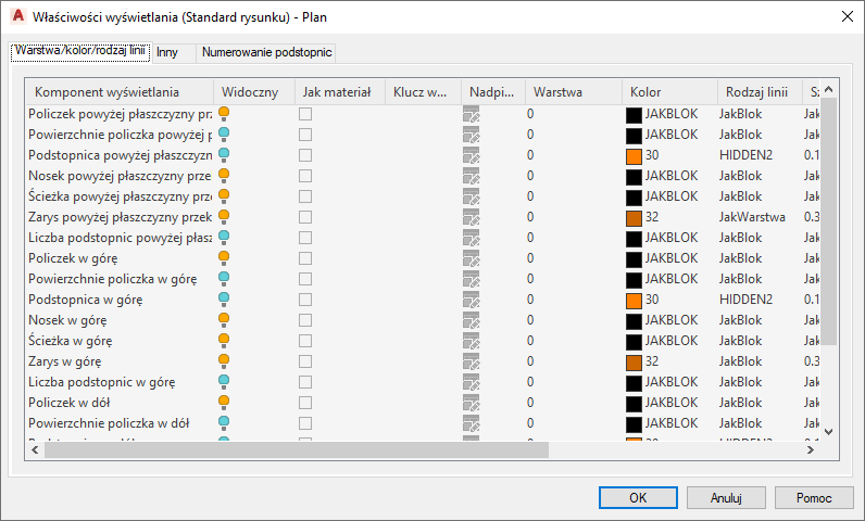 Ta procedura służy do określania kolejności wyświetlania komponentów schodów w widoku z góry w zależności, czy znajdują się powyżej czy poniżej poziomu płaszczyzny przekroju. Określić można właściwości komponentów powyżej płaszczyzny przekroju oraz komponentów górnego i dolnego biegu dla każdego typu komponentu schodów.