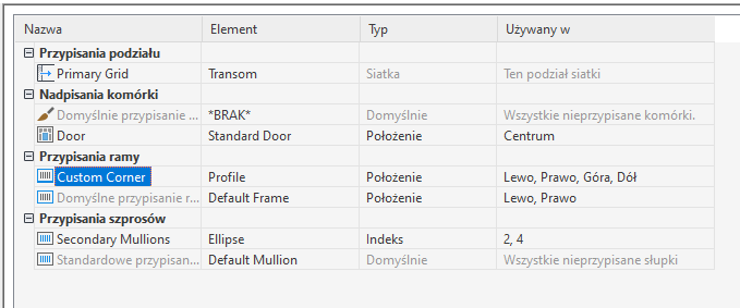Po utworzeniu definicji elementów stylu zestawu drzwi/okien można je nadawać poszczególnym rodzajom składników zestawów: podziałom, wypełnieniom komórek, ramom i szprosom.