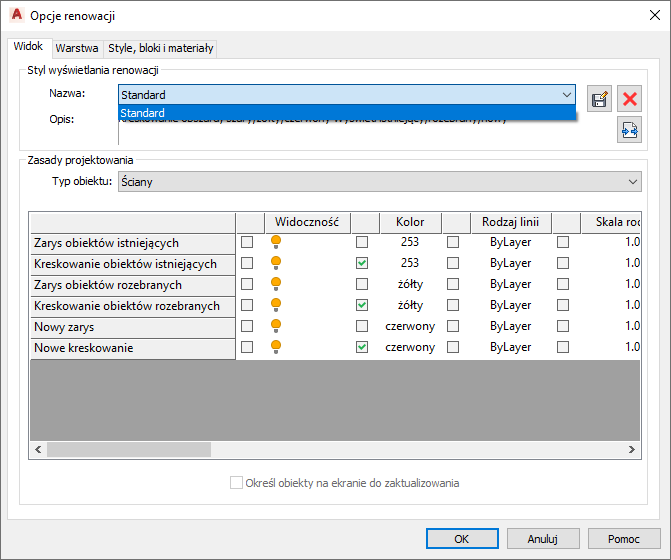 Sposób wyświetlania na rysunku właściwości obiektów w ramach określonych kategorii można zmienić poprzez ich odblokowanie, wprowadzenie zmian oddzielnie dla każdego typu obiektu i zapisanie ich jako stylu wyświetlania remontu. Wprowadzone zmiany są zapisywane w bieżącym rysunku.