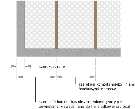 Domyślnie wymiarowanie komórek siatki jest dokonywane między punktem początkowym i końcowym linii bazowej zestawu drzwi/okien (w podziałach poziomych) lub między linią bazową a wysokością bazową (w podziałach pionowych). Obliczenia te nie uwzględniają szerokości ramy siatki. Jeśli na przykład zostanie narysowany zestaw drzwi/okien z linią bazową o długości 14 stóp (427 cm) oraz ramą o szerokości 1 stopy (30,5 cm) z lewej i prawej strony, przy zaznaczonej opcji stałej liczby komórek w podziale pionowym rozmiar komórek widocznych na ekranie będzie niejednorodny. Pierwsza i ostatnia komórka będą mniejsze, ponieważ do ich wymiarów będzie włączony wymiar ramy.