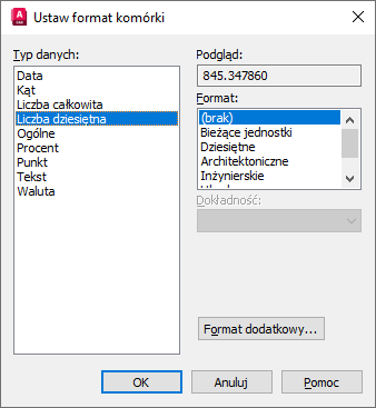 W zależności od wybranego typu danych wyświetla listę stosownych typów formatu. Na przykład, jeśli zostanie wybrany typ Kąt, wówczas lista Format będzie zawierać takie opcje, jak Stopnie dziesiętne, Grady, Radiany itp.