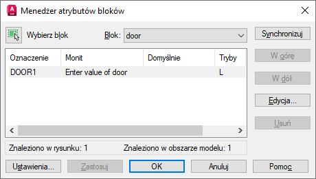 Pozwala edytować definicje atrybutów w blokach, usuwać atrybuty z bloków i zmienić kolejność, w jakiej będą się pojawiać monity dotyczące wprowadzania wartości atrybutów podczas wstawiania bloku.