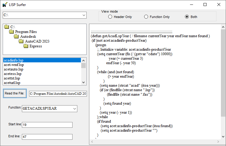 Wyświetla zawartość pliku AutoLISP według poszczególnych funkcji.