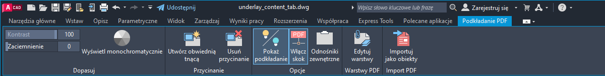 Po wybraniu podkładania PDF na wstążce zostanie wyświetlona karta kontekstowa PDF.