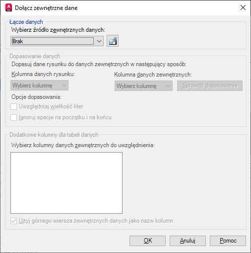 Wyświetla nazwy kolumn w kolejności, w jakiej się pojawiają w arkuszu. Zaznaczone kolumny są łączone z danymi rysunku za pośrednictwem dopasowywania danych.