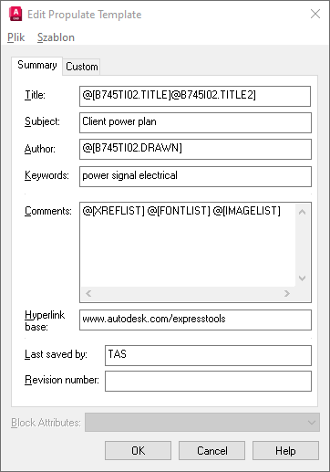 @[block.attributeTag] Wyodrębnia wartość oznaczenia atrybutu z bloku z atrybutami i wstawia ją w określonym polu. Przykład: wstawienie ciągu @[title.drawnby] w polu Autor spowoduje, że polecenie PROPULATE będzie przeszukiwało rysunek w celu odnalezienia bloku z atrybutami o nazwie „title” (nazwa), wyodrębniało wartość pola atrybutu „drawnby” (rysował) i wstawiało ją w polu Autor w oknie dialogowym Właściwości rysunku danego rysunku. Jeśli w całym projekcie są używane bloki wspólne, łatwo zaktualizować dużą liczbę rysunków, aby odzwierciedlić ich specyficzne wartości atrybutów.